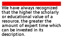 Much of our concern with the human side of the hybrid system coin is in developing multiple tiers of labor expenditure in indexing and description that match the quality of the resource. How much human metadata creation effort, beyond basic machine crawling and automated classification and near full-text indexing, needs to be applied? The answer is dependent on your scaling and sustainability strategies and questions of adequate coverage vs. adequate resource description as well as, ultimately, labor costs. The shorter and quicker the description, the more labor that can be expended on increasing coverage, and vice-versa. The time issue is very much involved here. Our goals have been indexing, not cataloging, and adequate, objective description, not reviewing. Within our approach, though, we have always recognized that the higher the scholarly or educational value of a resource, the greater the amount of expert time which can be invested in its description.
