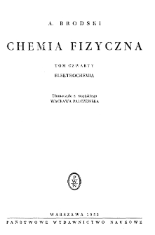 Palczewska, Wacława Tł. ; Dorabialska, Alicja. Red. ; Tytuł oryginału : A.I. Brodskij ,,Fiziczeskaja chimija" Czast` czetwiortaja "Elektrochimija" Izdanie szestoje ; Goschimizdat, Moskwa, 1948 ; Tom I niniejszej pracy wydało Państwowe Wydawnictwo Naukowe, tom II i III - Państwowe Wydawnictwo Techniczne