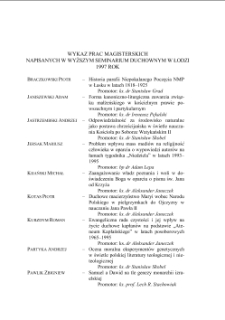 | WYKAZ PRAC MAGISTERSKICH NAPISANYCH W WYŻSZYM SEMINARIUM DUCHOWNYM W ŁODZI 1997 ROK | 2020-02-19 |
