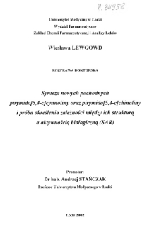 Tytuł: Synteza nowych pochodnych pirymido [5, 4-c]cynnoliny oraz pirymido [5, 4-c]chinoliny i próba określenia zależności między ich strukturą a aktywnością biologiczną (SAR)