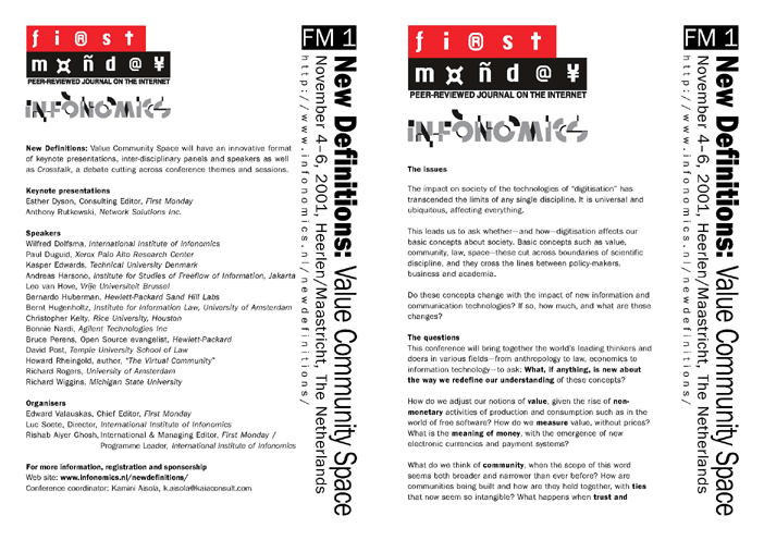 The first successful First Monday conference took place in November 2001 in Maastricht, the Netherlands at the International Institute of Infonomics.