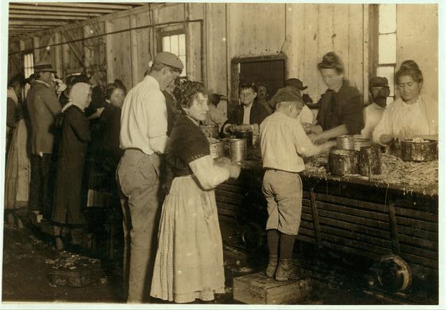 Figure 10: Some of the young shrimp pickers at Dunbar, Lopez, Dukate Co. Sore, swollen, and even bleeding fingers are common among these workers on account of the acid in the shrimp, Biloxi, Mississippi, February, 1911. Source: Library of Congress, Prints & Photographs Division, National Child Labor Committee Collection [reproduction number LCDIGnclc00844].