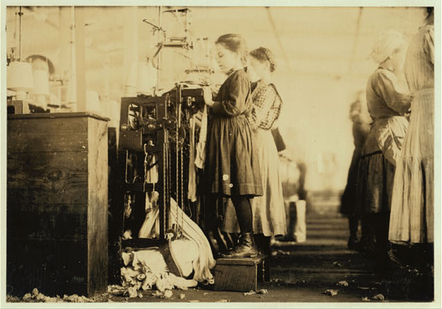 Figure 13: This little girl (like many others in the state) is so small she has to stand on a box to reach her machine. She is regularly employed as a knitter in Loudon Hosiery Mills, Loudon, Tennessee, December 1910. Source: Library of Congress, Prints & Photographs Division, National Child Labor Committee Collection [reproduction number LCDIGnclc02002].