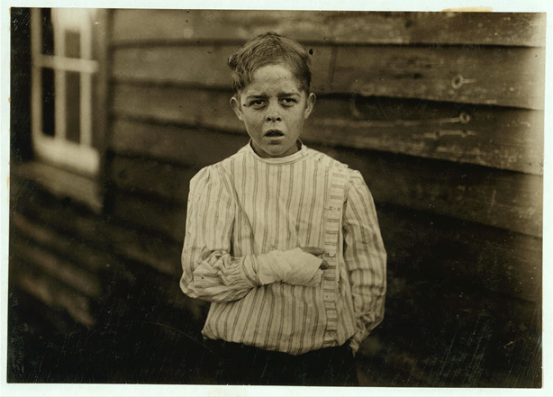 Figure 17: Accident to young mill worker. Giles Edmund Newsom (Photo October 23rd, 1912) while working in Sanders Spinning Mill, Bessemer City, N.C., August 21st, 1912, a piece of the machine fell on to his foot mashing his toe. This caused him to fall on to a spinning machine and his hand went into unprotected gearing, crushing and tearing out two fingers. He told the Attorney he was 11 years old when it happened. His parents are now trying to make him 13 years old. The school census taken at the time of the accident makes him 12 years old (parents statement) and school records say the same. His school teacher thinks he is 12. His brother is not yet 11 years old. Both of the boys worked in the mill several months before the accident. His father, (R.L. Newsom) tried to compromise with the Company when he found the boy would receive the money and not the parents. The mother tried to blame the boys for getting jobs on their own hook, but she let them work several months. The aunt said "Now hes jes got to where he could be of some help to his ma an then this happens and he cant never work no more like he oughter," Bessemer City, North Carolina, October, 1912. Source: Library of Congress, Prints & Photographs Division, National Child Labor Committee Collection [reproduction number LCDIGnclc02697].