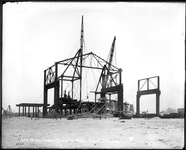 Figure 2: Open hearth number 4 from SW corner (one truss up), April, 1907. Source: Calumet Regional Archives, Indiana University Northwest, Gary, Indiana [ID number, CRA42101008].
