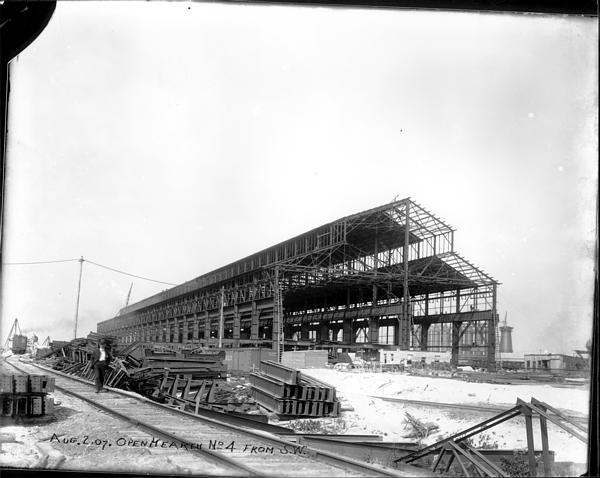Note the dramatic changes visible in subsequent photos of the mill site. The grading and leveling for an openhearth building had occurred in August, 1906. By April of 1907, one truss was up on open hearth number 4 (see Figure 2), and only one year after the grading and leveling, work on open hearth number 4 was nearly done (see Figure 3). Soon there would be over a dozen 60ton furnaces installed in number 4 and in each of the other openhearth furnace buildings being built at the site.