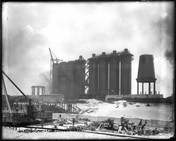 Figure 7: Blast furnaces and stoves numbers 11 and 12. Domes on 5 stoves; 6 courses on number 11; cols. up on number 12, July, 1907. Source: Calumet Regional Archives, Indiana University Northwest, Gary, Indiana [ID number, CRA42101058].