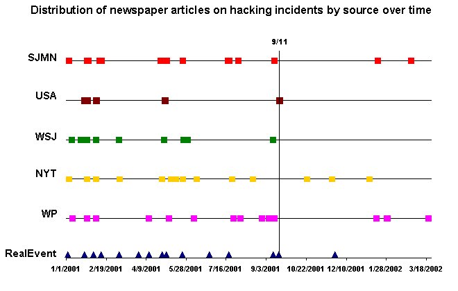 Figure 1: Distribution of newspaper articles on hacking incidents by source over time.