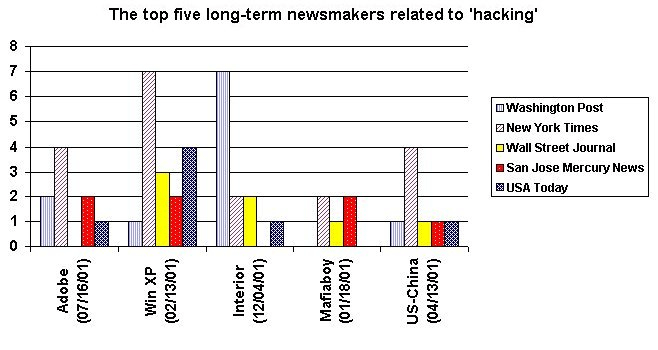 According to these findings, the Sklyarov incident was reported in all newspapers, except the Wall Street Journal, which again may have avoided using the word hack or hacker. Stories on hacking and Windows XP were also reported across the board, with the least attention by the Washington Post. On the other hand, the Post predictably seemed to be a lot more interested in reports on the computer vulnerabilities of the Interior Department. Reports on Mafiaboy and the U.S.China cyberskirmish appeared in all newspapers, but again with multiple stories in the New York Times and minimal attention by the Washington Post.