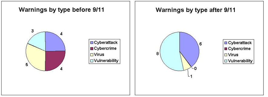 First, it should be considered that many of these reports are actually about hacking incidents that never happened, that is, what hackers could do or could have done. This tendency is demonstrated by the fact that almost 10 percent of all sentences examined are in the conditional tense. Even more interestingly, the ratio of conditional tense for sentences with hacking or hackers mentioned in them increased more than twofold: 30.4 percent before, and 69.6 percent after September 11.