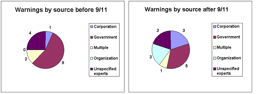 It is visible from this chart that cybercrime warnings fall exclusively in the first few months of 2001, while vulnerability warnings increased in the last few months of 2001. In addition, cyberattack warnings are concentrated around the U.S.China cyber conflict in May 2001 and around the weeks following September 11. If we compare this chart with the one that groups these warnings by the type of entity that issued them (below), it is apparent that there are more warnings after September 11 by corporations and nongovernmental organizations. It can be explained by the changed political climate, that is, more organizations feel the need to warn the public once vulnerabilities are found, and similarly, more corporations seem to be willing to reveal vulnerabilities in their products or servers, even if they compromise trust and public image.