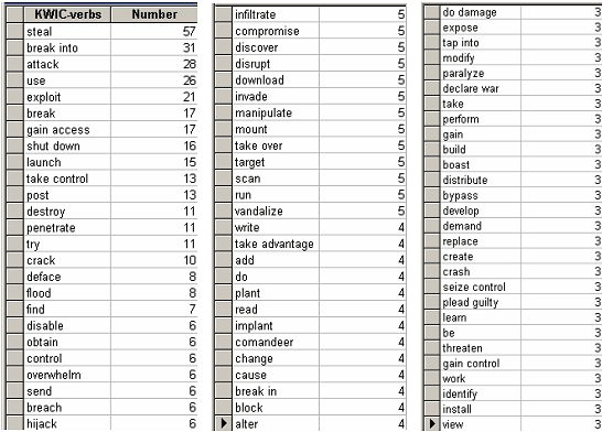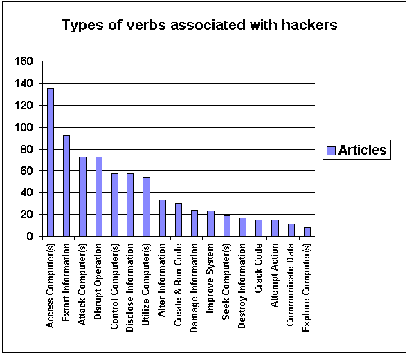 For a better understanding of what hackers do according to newspaper reports I grouped these verbs into types of actions that best represent the nature of that activity. So, for example, "gain access," "enter," "breach," "break into," etc., were collected under the heading Access Computer(s), while "steal," "compromise," "download," "obtain," etc., were summed under Extort Information. While some of these categories seem to overlap, I attempted to devise them so that the verbs based on their specific context in the sentence if in doubt would fit best in only one category.
