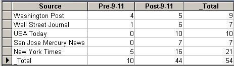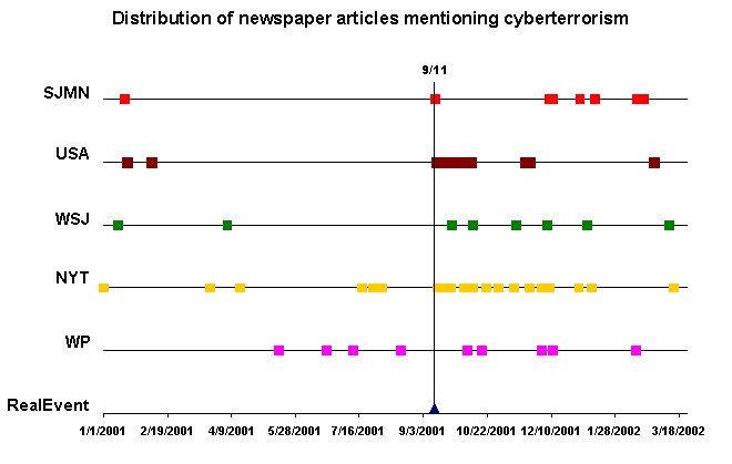 I immediately found that the number of hits was more than what could be handled. There were approximately 660 articles altogether in four of the five target newspapers for the roughly one year period of which 911 fell exactly in the middle. What is informative, however, is that about 640 of them (97 percent) were published after September 11. I further experimented with the search phrase to find that if the two terms were required to be within five words of each other, the result was about 270 hits, 95 percent of which were post-911. Looking for the exact phrase "cyberterrorism," I found only 31 occurrences, 24 (77 percent) of which came after 911. Finally, I also looked at hacker(s) occurring together in the same sentence with terrorists or terrorism (hacker! w/s terroris!) only to locate 17 articles before and six after September 11.