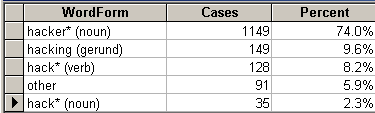 The most frequent form of the word hack* was hacker or hackers (74 percent).