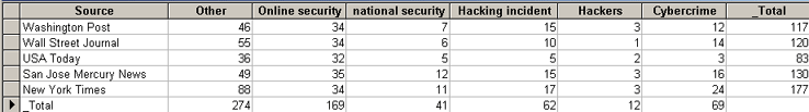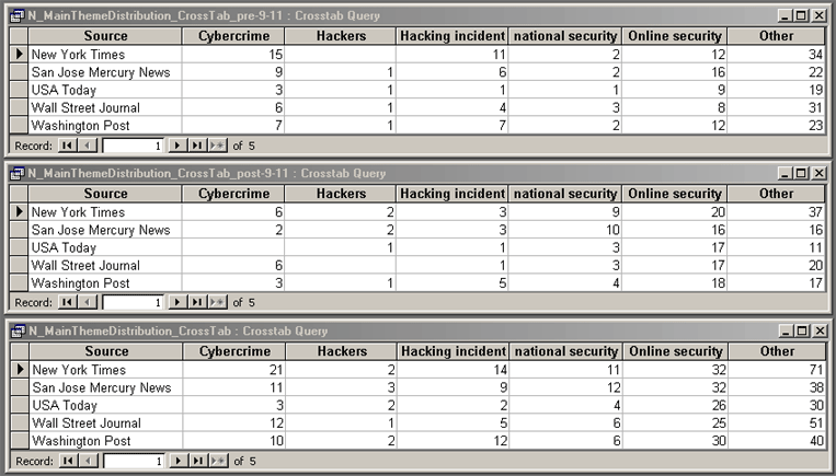 The upper two thirds contain the numbers before and after 911, while the bottom third has the totals. It is immediately apparent that the framing of these articles as cybercrime decreased, while articles on national security and online security increased. Stories on hackers slightly increased (except for the Wall Street Journal). Other interesting changes include the fivefold increase of San Jose Mercury News articles on national security, and the increased attention to online security, but no change for cybercrime themes in the Wall Street Journal. The reason is probably the Journal’s business orientation, which makes cybercrime committed against companies and online retailers a particular interest.