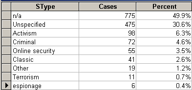 The apparent motivation of hackers was also coded, according to how the act was framed in the sentence. I realize that the motivations presented are rather dependent on the context (framing), since what is activism for one may be terrorism for another, or what is classic hacking for one, a criminal activity for another. Thus, I examined the framing of the article (versus the actual motivations possibly revealed on the sentence level). Classic hacking contains, for example, anticopyright activities (but not for further sale of the hacked or cracked product), or anything that defies authority. For the authorities, of course, these are all criminal acts. Similarly, a politically motivated hacking act falls under activism, while it could be framed by the target as an online security breach, or by the authorities as crime or even as terrorism threatening national security.