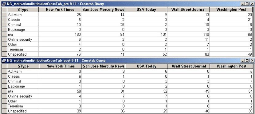 The following table shows the distribution of indicated motivations for each newspaper before and after 911. The numbers demonstrate that hacking framed as activism and criminal activity clearly decreased following September 11, while the online security and terrorism angles slightly increased.