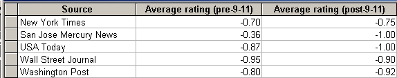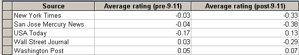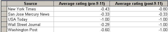 Similarly, the average rating for hackers based on what other subjects were mentioned together in the same sentence did worsen after September 11, except for the Wall Street Journal, which moved upwards, although not significantly.