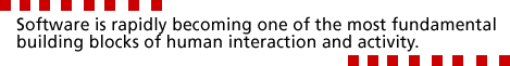 Writing about the importance of software is difficult without resorting to what seems to be empty hyperbole. However it is important to point out that software is rapidly becoming one of the most fundamental building blocks of human interaction and activity. Authors such as Negroponte (1996), Mitchell (1996), Castells (1996), and Balkin (1998) have tried to help us understand the way in which software is changing most aspects of our lives. Despite the work these authors there is a common misconception that software is a complex component which in some sense "lives" within computer hardware. By confining software to the inner workings of the computer most nontechnical software users are unaware of the extent to which software permeates their lives.