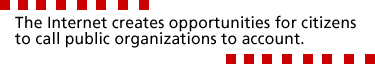 The growing importance of the Internet adds a new dimension to these new forms of accountability. The Internet enables citizens to get direct information about the functioning of government organizations and the actions of politicians and civil servants. Citizens can interact directly with politicians and civil servants and ask them to explain and justify their actions. One can argue that the Internet creates opportunities for direct accountability to citizens.