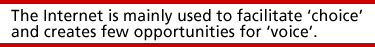 The opportunities that are created for evaluating the performance of public organizations seem to focus on the role of citizens as consumers. The Internet is mainly used to facilitate ‘choice’ and creates few opportunities for ‘voice.’ Quality Cards support citizens in choosing a school but the Internet is not used to stimulate debate between School Inspection Services, schools and citizens on the quality of these schools. Waiting List Monitors enable citizens to choose a hospital with a short waiting list but does not provide for a discussion on health care. Risk maps display risks but do not enable citizens to discuss these risks. Citizens are regarded as consumers that can make a choice and not as ‘citoyens’ that are involved in public affairs.Citizens make little use of the Internet