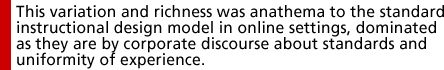 As I thought about these matters I realized that no two classes I have ever taught were identical, even if I was covering the same content. I was even different in successive class meetings over the same semester. At a superficial level, I was different because I wore different clothes, cracked different jokes, interacted with students differently. However, at a deeper level, I was different because I came to class with a growing understanding of the content, and the group. However, this variation and richness was anathema to the standard instructional design model in online settings, dominated as they are by corporate discourse about standards and uniformity of experience. This uniformity is further reflected in the fact that the front pages of most online courses often remained unchanged over the period of the semester. This page usually had some introductory text, describing the course and the instructor, and irrespective of whether you were visiting the site for the first time or the fiftieth, this content stayed the same. It was as if you were given the introductory spiel every time you went to a class meeting. Imagine beginning each and every class with "Welcome to CRS568: Learning Technology by Design. I look forward to an exciting semester as we play and learn together." Imagine how horribly boring that would be, ignoring the shared experience we were building up together.