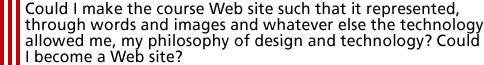 And this is when the radical idea struck me. Could I make the Web site (this bottleneck that so constrained me) convey this complex, subtle tone? Since the students could not see me, could I manipulate what they could see to convey some of the meanings I tried to do in my facetoface class? In other words, could I replace my face with the interface? Could I make the course Web site such that it represented, through words and images and whatever else the technology allowed me, my philosophy of design and technology? Could I become a Web site?
