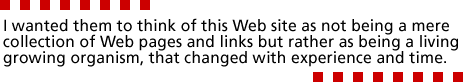 But who was I? Or maybe a better question was who did I want my students to think I was? My needs were often contradictory. I wanted my students to see me as being wise and funny, benevolent and yet firm, knowledgeable yet accessible, cerebral but warm. How could a Web site represent these contradictory impulses? And as important, how could I do this using clumsy Web design tools and arcane language of HTML?