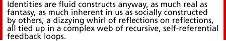 One thing is clear, as the title of this piece indicates, becoming is never an end in itself. It is a process of unfolding and exploration. Identities are fluid constructs anyway, as much real as fantasy, as much inherent in us as socially constructed by others, a dizzying whirl of reflections on reflections, all tied up in a complex web of recursive, selfreferential feedback loops. Is it all that surprising that teaching a course online can lead to significant changes in how we think of ourselves as educators? Is it so surprising that our identities can also be in some metaphorical yet truthful way become part of our technologies of teaching?