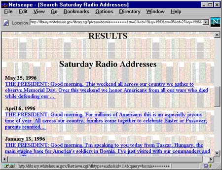 The new service makes extensive use of audio. Not only can citizens search for documents, but they can search the archive of the President's Saturday radio addresses and listen to the section of the speech in which the President talks about what interests them. The new service also includes a database of photos of important events in the Clinton Administration.