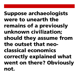 Suppose archaeologists were to unearth the remains of a previously unknown civilization; should they assume from the outset that neo-classical economics correctly explained what went on there? Obviously not. Much the same applies to cyberspace, including the Net. In effect it is a newly discovered civilization, despite the fact that we ourselves and our descendants will inhabit it. Without examination, nothing justifies concluding in advance that neo-classical economics will apply. Indeed, because life in cyberspace is so different from what we are used to outside it, as a first guess, it makes sense to tilt against that supposition.