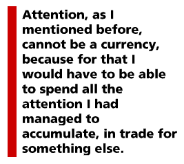Attention, as I mentioned before, cannot be a currency, because for that I would have to be able to spend all the attention I had managed to accumulate, in trade for something else. But that is impossible. The attention I have resides in others' minds, and I cannot perform an operation to make them believe, say, that all the time they were paying attention not to me but to you. A currency that cannot be handed over at will cannot be spent at will and so is not much of a currency, certainly.