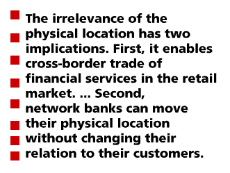 The irrelevance of the physical location has two implications. First, it enables cross-border trade of financial services in the retail market. Without legal restrictions, agents can shop for financial services anywhere on this planet as long as the network bank has access to a local ATM network to obtain cash. However, the emergence of electronic money, respectively digital cash, could even remove this requirement. White (1996) has stressed this fact:
