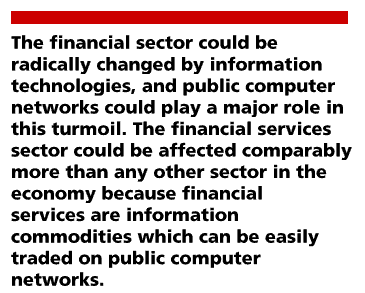 These predictions are simplistic and are not based on analyzing this issue. However, the facts are (a) financial services are information commodities and (b) public computer networks offer a fast, cheap way to trade information. Public computer networks can radically improve efficiency and competition in the financial services sector. Increased efficiency and competition rely on three characteristics of these networks: