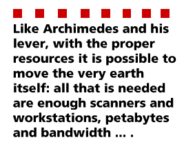 While the scale and realities of such aspirations might make those of us in the libraries wince (especially since we would be the ones responsible for doing this), it is hard to fault the basic expectations underlying this. After all, it is the scholar's job to conduct research; and it is the research librarian's job to make the raw material of that research - monographs, serial publications, primary resources, etc. - as accessible as possible. For the past several years, we librarians have been touting the concept of the "virtual" or digital library and have offered up just enough examples to give this idea some legitimacy. We now know that it is technically, or more exactly, technologically possible to "digitize everything." Like Archimedes and his lever, with the proper resources it is possible to move the very earth itself; all that is needed are enough scanners and workstations to do the work, enough petabytes of disk space to store the material, and enough bandwidth to move it quickly and efficiently around the world.