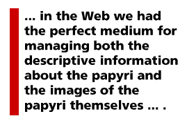 While the technical details of our various experiences in this area are interesting as an object lesson in trying to harness and manage rapidly evolving technology, they are not particularly germane here. What is important is that in the midst of this project the World Wide Web burst onto to the scene. It immediately became apparent that the database model we were pursuing was not the answer and that in the Web we had the perfect medium for managing both the descriptive information about the papyri and the images of the papyri themselves - to say nothing of exponentially broadening access to the collection.