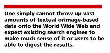 As exciting as the papyrus archive project has been though, in some ways it has been a tough act to follow. This has been particularly the case since it was an example of a project in which an entire collection was digitized and it has been difficult to apply its logic and methodologies to other collections. However, one of its more interesting aspects has been the application of the aforementioned dynamic linkages between such metadata as cataloging records and electronic versions of actual collection materials. This has been especially intriguing from the perspective of archival description and cataloging.There are two reasons for this. The first relates to the larger issue of metadata and the virtual library. While it is now possible to digitize the books, periodicals, primary sources, etc., found in research libraries, we have discovered that traditional approaches to managing bibliographic metadata - that is, cataloging - is longer adequate to the task. Whether this is related to a higher level of expected retrieval by users in an electronic environment or whether our descriptive cataloging models (which, unfortunately, are still firmly rooted in the 19th century) no longer work is not clear. What is clear is that digital information as it exists on the Internet today requires more navigational, contextual, and descriptive data than is currently provided in traditional card catalogs or their more modern electronic equivalent. One simply cannot throw up vast amounts of textual or image-based data onto the World Wide Web and expect existing search engines to make much sense of it or users to be able to digest the results.