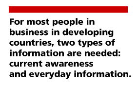 For most people in business in developing countries, two types of information are needed: current awareness and everyday information in business. To satisfy them, documents of various kinds are often collected and stored, including monographs, business journals, textbooks bulletins, reports, standard specifications, and correspondence. Each of these documents may contain information relevant to business. An organisation has an enormous task of organising this mass of material in such a way so that the right answer can be located when needed. Problems occur when this mass of information may become too large to handle or too difficult to maintain. As a one solution, some businesses in developing countries are beginning to use the Internet as an information resource.