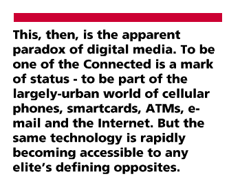 This, then, is the apparent paradox of digital media. To be one of the Connected is a mark of status - to be part of the largely-urban world of cellular phones, smartcards, ATMs, e-mail and the Internet. But the same technology is rapidly becoming accessible to any elite's defining opposites: township and poor rural communities. The old laws of economics, in which the prices of luxury goods would be driven up in accordance with their status, seem to be working in the opposite direction.