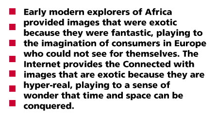 Early modern explorers of Africa provided images that were exotic because they were fantastic, playing to the imagination of consumers in Europe who could not see for themselves. The Internet provides the Connected with images that are exotic because they are hyper-real, playing to a sense of wonder that time and space can be conquered. The novel Neuromancer offered racialised representations of Africans free from spatial ties to Africa, while Mala Mala offers the Internet tourist Africa's wilderness free from sequential time. Wild Africa, free from history, is a long established trope; elite Digital Culture extends it into unbounded space and time [30]. Representations of Africa such as these, and the commodities that they present, are stalls in the virtual mall. In the redistribution of consumption that is enabled by the Internet, the credit-worthy shopper can be located in New York, Nairobi or New Delhi. This global, electronic economy carries with it the social relations of computer-mediated communication, building the "lifestyle enclaves" of unilingual, homogenous interests, whether through the cultural jokes of newsgroups, the conferences of the WELL, distance education, on-line games, or virtual sex.