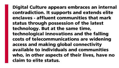 In both its technology and in the Internet's content, then, Digital Culture appears to embrace an internal contradiction. In many respects, it supports and extends elite enclaves - affluent communities that mark status through possession of the latest technology, and that purchase and consume products on the Internet, whether these be books, news, financial services or African safaris. But at the same time, technological innovations and the falling costs of telecommunications are widening access and making global connectivity available to individuals and communities who, in other aspects of their lives, have no claim to elite status. Everyone can be whom they wish in a Chat Room, and there is no doorman to stop you entering a virtual store.