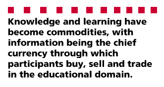 It is important to contextualise these potential developments. The information age ushers in changes in the role of state and the emergence of new (sometimes uneasy or even contradictory) alliances of power. Among other defining features, this moment witnesses a diffusion of social responsibilities into the private (or philanthropic) sphere and an apparent reduction in the regulatory life of bureaucracies and institutions of all kinds. Accompanying these trends, however, is the need (desire) for greater control over individual subjects who negotiate the fresh pathways of competitive consumption in a computerised world. This process has been accelerated in the past decade as computers have become more sophisticated and widespread within the realms of commerce, education and the home. Its origins lie, however, in the shift from mechanical and electrical technological systems to new language-based technologies. This shift has prompted a change in the status of knowledge: information has become a (increasingly the) major medium of exchange. Knowledge and learning have become commodities, with information being the chief currency through which participants buy, sell and trade in the educational domain (Lyotard, 1984, 1993).