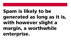 Seen another way, the means for communicating to 30 million people on this planet for a mere investment of a few thousand dollars did not exist until a few years ago. At 28.8bps, dispatching bulk e-mail takes considerable time, and one has to allow for the many addresses no longer valid. Still, improvements in hardware and broadening of bandwidth increase, if anything, the relative advantage of the spammer.