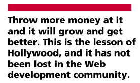 From staff titles to schedules to project philosophy, many commercial Web development "studios" follow the film-production model. There are producers, directors, writers, editors, designers, technical specialists, and personalities - be it a well-known columnist, chat moderator, or a fictional character. Projects move through a pre-production/planning stage to a production mode, where work is often displayed on a staging server before going "live". When production wraps, the project launches on a specified date on a specified time, not unlike a premiere for a feature film. As someone who has worked for multiple Internet start-ups, it's easy to see how the start-up in this context can be illustrated as the independent filmmaker, working on a minimal budget, under tight deadlines and often against impossible odds. Following economy of scale, as the budget increases, so does the ability to increase resources, staff, and development time and costs. Overall, the pattern remains fairly constant: throw more money at it and it will grow and get better [2]. This is the lesson of Hollywood, and it has not been lost in the Web development community [3].