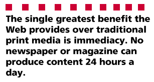 The corollaries between the Web and the print industry are many, however if I had to choose the single greatest benefit the Web provides over traditional print media it is this: immediacy. In short, there are no newspapers or magazines that can produce content 24 hours a day. Print is constrained by production and time. Frequency of distribution is limited to how much you can spend on production and publication. Again, the constraint is on distribution of the information. The range of distribution via print is directly scaleable with the amount of money you put into publishing the information. Along with immediacy, the Web provides the ability to deliver a tremendously larger amount of content than traditional print. This is a often taken for granted, but it is extremely important.