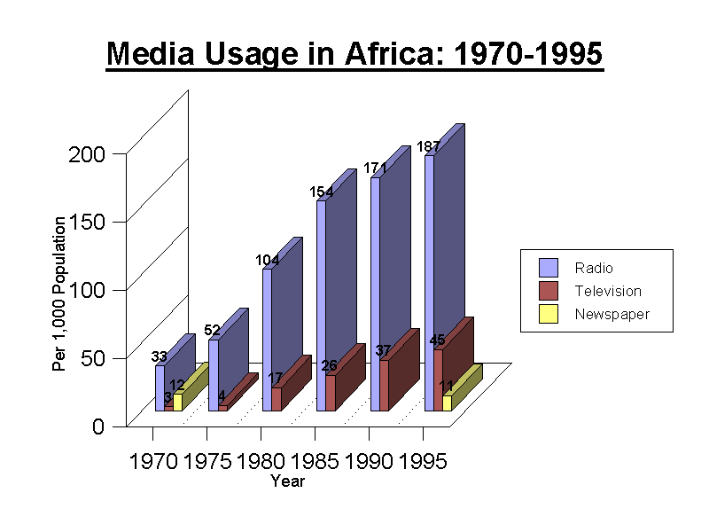 Radio/Television. Despite the growing popularity of the Internet, radio and television still represent the mode through which the majority of Africans receive information about national and international events. Radio is by far the most prominent source of information for Africans in general, even when compared to television or newspapers. For example, a 1995 media survey in Niger's two largest cities, conducted by a French firm with assistance from U. S. Information Agency (USIA), found that radio sets were widely available, while television and satellite television were not. Radio news (both from foreign stations such as Voice of America (VOA), and local stations) was a major source of information for people, even in these urban locations. UNESCO reports echo these findings - their Statistical Survey shows that average radio usage throughout sub-Saharan Africa (145 transmitters per 1,000 people) is far greater than television (23 per 1,000 people) or newspapers (circulation of 10 per 1,000). Radio and television broadcasts can be received (provided you have a receiver) throughout most of Africa, and literacy is not a requirement as it is for newspaper consumption. Figure 1 shows the trend of radio, television and newspaper usage in sub-Saharan Africa for the past 20 years.