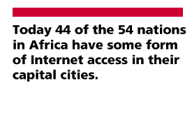 Internet. It is an astounding fact that where the Internet barely existed in Africa even five years ago, today 44 of the 54 nations in Africa have some form of Internet access in their capital cities. But as Mike Jensen notes, "Of the countries with full Internet access, only Burkina Faso, Mauritius, Morocco, Senegal, South Africa and Zimbabwe have pervasive local dialup facilities outside of the capital city, while Benin, Botswana, Egypt, and Kenya have services in the second major city" [9]. Jensen notes that access costs are generally higher in Africa than elsewhere, and Aden (1995) argues that this may be related to the profit margins of the telecommunications sector in African countries, where the revenue per subscriber line is twice as high as in Europe [10]. Aden argues that the two greatest impediments to the development of electronic communication in Africa are insufficient infrastructure and regulatory barriers. Infrastructure limitations include such problems as scarce and/or poor quality telephone lines, unreliable power supplies, outdated equipment, and a lack of knowledge and training. Regulatory barriers include government monopolies on telecommunications, high access rates for telephone service, and legal disincentives to foreign investment. The result is that for much of Africa: