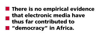 1. At present, there is no empirical evidence that electronic media have thus far contributed to "democracy" in Africa. Despite the long-standing presence of both radio and television in some African countries, there appears to be little linkage between access to these forms of media and political democracy. This may be the result of the state control of radio and television for much of the period for which data is available. It is only in the last five years that private radio and television has been allowed to exist in many African countries, and some lag time may be required for effects to become noticeable. In addition, the impact of electronic media on political activity is difficult to measure quantitatively across the continent. As Ronning (1994) argues: