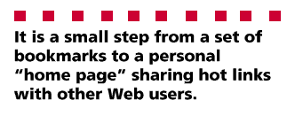 For this reason, schemes to search, label and organize Web resources abound. Web browsing applications from Mosaic to Netscape Navigator have recognized and addressed this tendency: the capacity to bookmark the URLs of specific sites is built into their design. It is a small step from a set of bookmarks to a personal "home page" sharing hot links with other Web users. Another small step leads from personal home pages to "home pages" for institutions, with content that aspires to general rather than merely personal appeal. At the farthest end of this path we find the commercial search engines, of which Yahoo! in particular is noteworthy for its subject tree approach to managing a vast array of links.