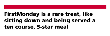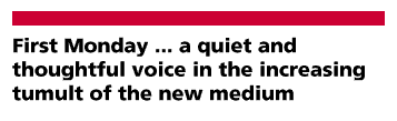 First Monday is a rare treat, like sitting down and being served a ten course, 5-star meal. One becomes stuffed with "wonderous information'; which like any great wine, needs decanting and savouring. Many birthday congratulations to all whom help to keep this very fine E.Journal going - First Monday is literally one of the few places on the Internet where I know I will be able to find expert information which I can immediately translate into action.